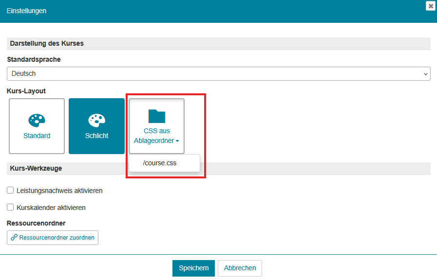 Einstellungen > Kurs-Layout > CSS aus dem Ablageordner > CSS Datei auswählen